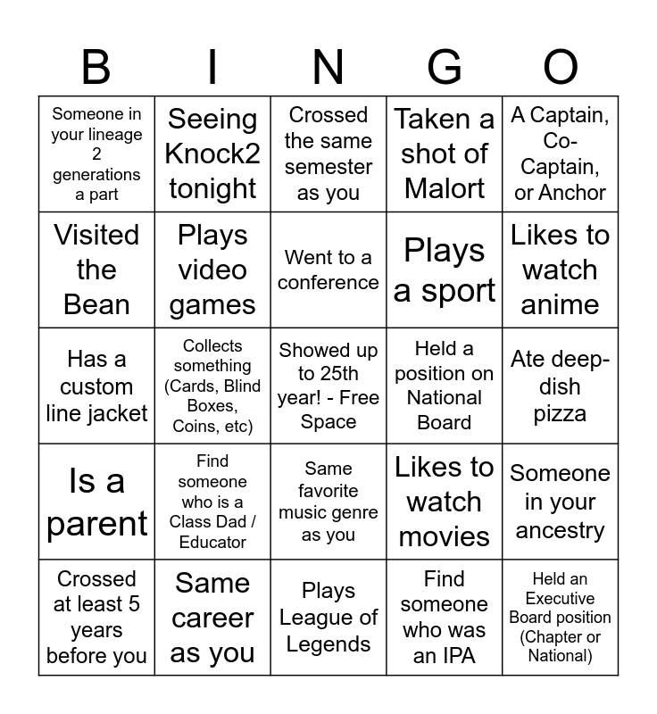 This bingo card has a free space and 30 words: Traveled out of state, Same career as you, Crossed the same semester as you, Crossed before you were born, A Captain, Co-Captain, or Anchor, Someone in your lineage 2 generations a part, Plays video games, Went to a conference, Plays a sport, Held an Executive Board position (Chapter or National), Crossed at least 5 years before you, Find someone who is a Class Dad / Educator, Find someone who was an IPA, Past President (Chapter or National), Is a parent, Owns a pet, Plays League of Legends, Held a position on National Board, Someone in your ancestry, Visited the Bean, Collects something (Cards, Blind Boxes, Coins, etc), Have tried a Chicago Dog, Taken a shot of Malort, Ate deep-dish pizza, Has a custom line jacket, Seeing Knock2 tonight, Same favorite music genre as you, Likes to watch movies, Likes to watch anime and Share the same birthday month as you.