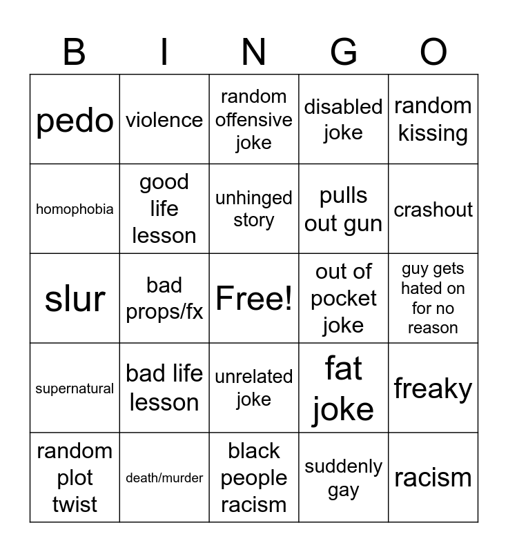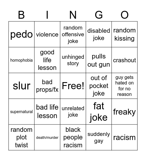 This bingo card has a free space and 24 words: bad life lesson, death/murder, unhinged story, random plot twist, random kissing, pedo, homophobia, violence, out of pocket joke, unrelated joke, pulls out gun, slur, fat joke, freaky, good life lesson, suddenly gay, guy gets hated on for no reason, random offensive joke, crashout, bad props/fx, racism, supernatural, disabled joke and black people racism.