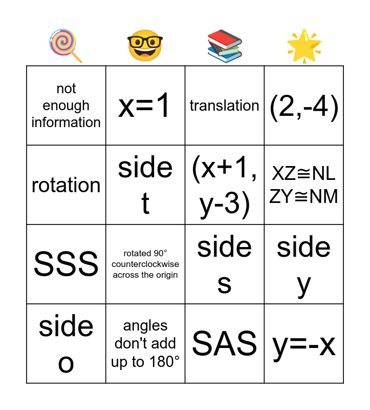 This bingo card has 16 words: angles don't add up to 180°, side y, translation, not enough information, SSS, x=1, side s, SAS, rotation, side t, side o, (2,-4), rotated 90° counterclockwise across the origin, XZ≅NL ZY≅NM, (x+1, y-3) and y=-x.