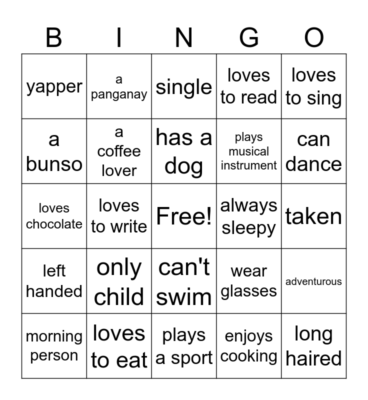 This bingo card has a free space and 24 words: only child, loves to eat, has a dog, morning person, loves to sing, yapper, a bunso, a panganay, always sleepy, can't swim, plays musical instrument, loves chocolate, wear glasses, adventurous, a coffee lover, enjoys cooking, taken, single, can dance, loves to write, long haired, left handed, loves to read and plays a sport.