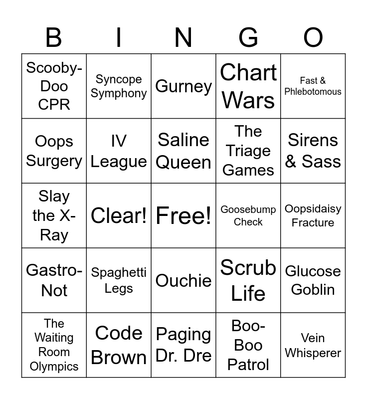 This bingo card has a free space and 30 words: Code Brown, V-Fib, Clear!, Medic!, Scooby-Doo CPR, Gurney, IV League, Ouchie, Goosebump Check, Paging Dr. Dre, Oopsidaisy Fracture, Vein Whisperer, Boo-Boo Patrol, Lifeguard Chair, Sirens & Sass, Caffeine Infusion, Scrub Life, Gastro-Not, Spaghetti Legs, Fast & Phlebotomous, Slay the X-Ray, Laryngospaz, Syncope Symphony, The Triage Games, Oops Surgery, Chart Wars, Glucose Goblin, The Waiting Room Olympics, Saline Queen and Who Let the Docs Out?.