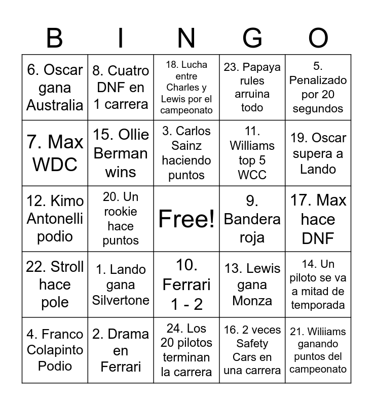 This bingo card has a free space and 24 words: 1. Lando gana Silvertone, 2. Drama en Ferrari, 3. Carlos Sainz haciendo puntos, 4. Franco Colapinto Podio, 5. Penalizado por 20 segundos, 6. Oscar gana Australia, 7. Max WDC, 8. Cuatro DNF en 1 carrera, 9. Bandera roja, 10. Ferrari 1 - 2, 11. Williams top 5 WCC, 12. Kimo Antonelli podio, 13. Lewis gana Monza, 14. Un piloto se va a mitad de temporada, 15. Ollie Berman wins, 16. 2 veces Safety Cars en una carrera, 17. Max hace DNF, 18. Lucha entre Charles y Lewis por el campeonato, 19. Oscar supera a Lando, 20. Un rookie hace puntos, 21. Wiliiams ganando puntos del campeonato, 22. Stroll hace pole, 23. Papaya rules arruina todo and 24. Los 20 pilotos terminan la carrera.