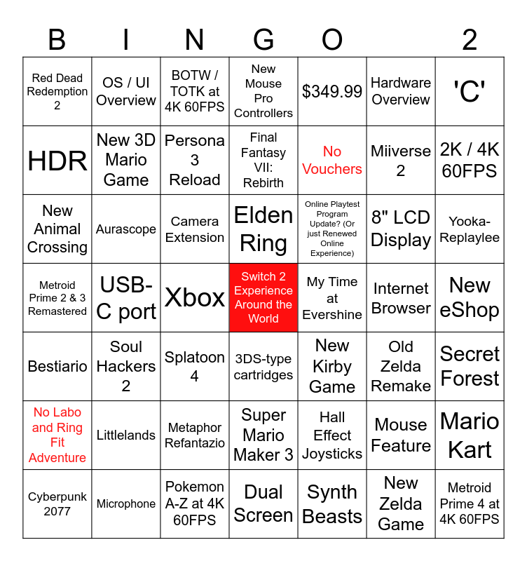 This bingo card has a free space and 48 words: Hall Effect Joysticks, Miiverse 2, Dual Screen, USB-C port, Camera Extension, New eShop, OS / UI Overview, Microphone, Hardware Overview, 3DS-type cartridges, 'C', New Mouse Pro Controllers, 8" LCD Display, Online Playtest Program Update? (Or just Renewed Online Experience), No Labo and Ring Fit Adventure, Internet Browser, HDR, 2K / 4K 60FPS, Mouse Feature, $349.99, No Vouchers, Xbox, Red Dead Redemption 2, New 3D Mario Game, Mario Kart, Persona 3 Reload, Yooka-Replaylee, Cyberpunk 2077, Elden Ring, Aurascope, New Zelda Game, My Time at Evershine, Secret Forest, Littlelands, Metroid Prime 2 & 3 Remastered, New Kirby Game, Old Zelda Remake, New Animal Crossing, Splatoon 4, Metaphor Refantazio, Bestiario, Metroid Prime 4 at 4K 60FPS, BOTW / TOTK at 4K 60FPS, Pokemon A-Z at 4K 60FPS, Final Fantasy VII: Rebirth, Super Mario Maker 3, Soul Hackers 2 and Synth Beasts.