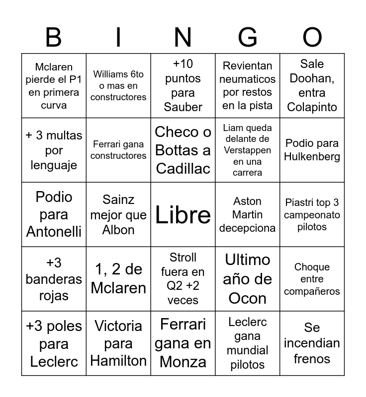 This bingo card has a free space and 24 words: 1, 2 de Mclaren, Victoria para Hamilton, Checo o Bottas a Cadillac, +3 poles para Leclerc, Sale Doohan, entra Colapinto, Mclaren pierde el P1 en primera curva, + 3 multas por lenguaje, Williams 6to o mas en constructores, Aston Martin decepciona, Stroll fuera en Q2 +2 veces, Liam queda delante de Verstappen en una carrera, Podio para Antonelli, Ultimo año de Ocon, Choque entre compañeros, Ferrari gana constructores, Leclerc gana mundial pilotos, Piastri top 3 campeonato pilotos, +10 puntos para Sauber, Podio para Hulkenberg, Sainz mejor que Albon, Se incendian frenos, +3 banderas rojas, Revientan neumaticos por restos en la pista and Ferrari gana en Monza.