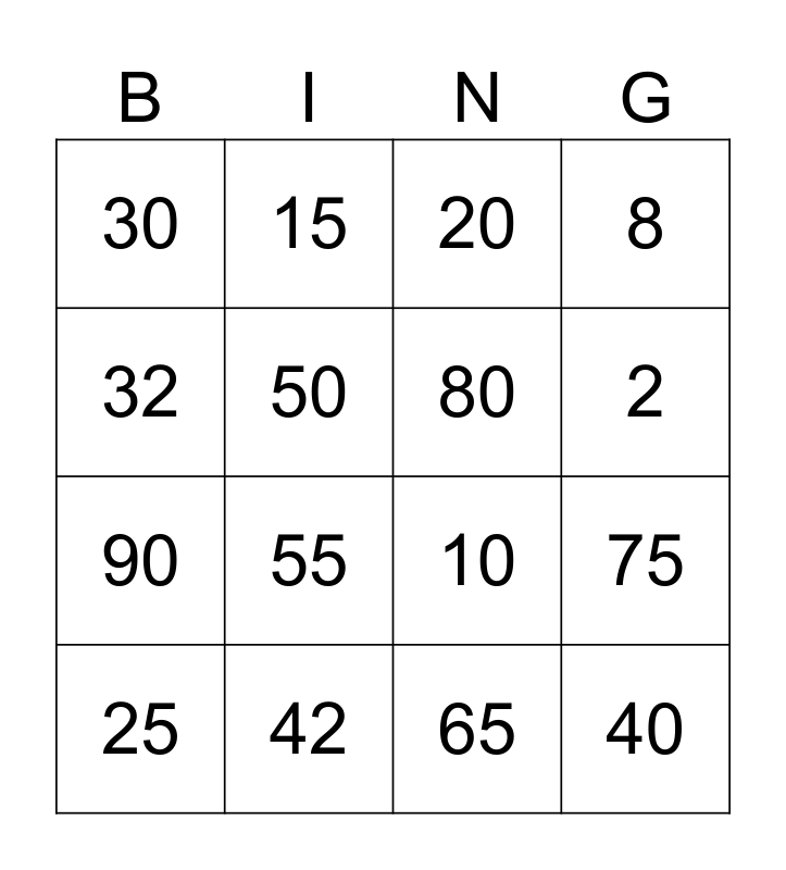 This bingo card has 21 words: 42, 60, 15, 100, 65, 80, 30, 20, 10, 2, 90, 8, 40, 47, 50, 70, 25, 55, 32, 75 and 82.