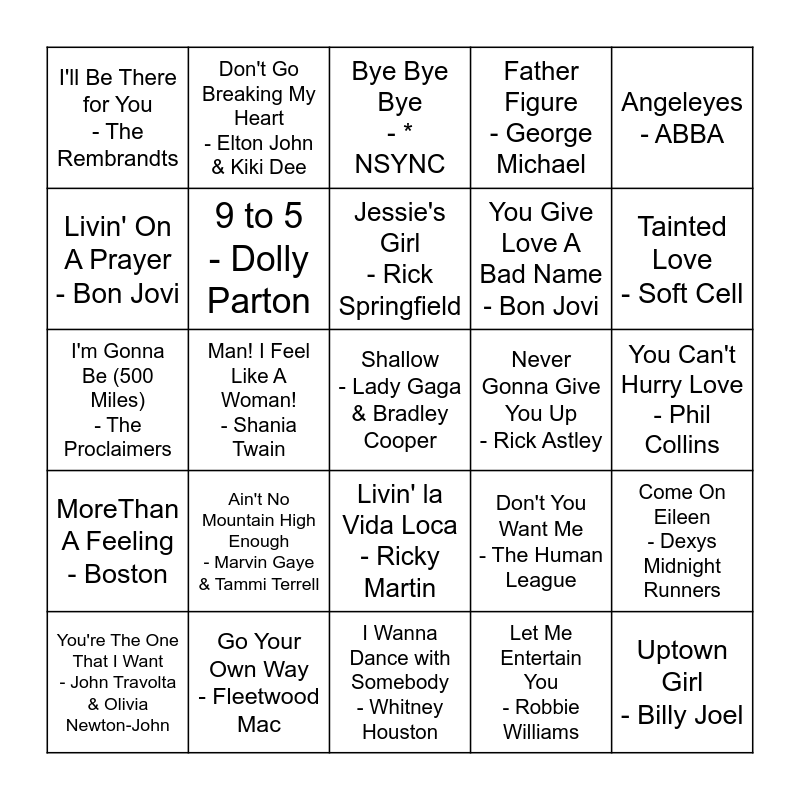 This bingo card has 50 words: Don't Stop Believin' - Journey, Shallow - Lady Gaga & Bradley Cooper, Wannabe - Spice Girls, I Wanna Dance with Somebody - Whitney Houston, Ain't No Mountain High Enough - Marvin Gaye & Tammi Terrell, Summer Nights - John Travolta & Olivia Newton-John, Don't Go Breaking My Heart - Elton John & Kiki Dee, Another One Bites The Dust - Queen, Livin' On A Prayer - Bon Jovi, Holding Out for a Hero - Bonnie Tyler, 9 to 5 - Dolly Parton, Father Figure - George Michael, Come On Eileen - Dexys Midnight Runners, Don't You Want Me - The Human League, Don't You (Forget About Me) - Simple Minds, Girls Just Want to Have Fun - Cyndi Lauper, Jessie's Girl - Rick Springfield, Never Gonna Give You Up - Rick Astley, Summer Of '69 - Bryan Adams, Angeleyes - ABBA, Man! I Feel Like A Woman! - Shania Twain, Let Me Entertain You - Robbie Williams, I'll Be There for You - The Rembrandts, You Give Love A Bad Name - Bon Jovi, The Winner Takers It All - ABBA, Uptown Girl - Billy Joel, Tainted Love - Soft Cell, Believe - Cher, Bye Bye Bye - *NSYNC, Livin' la Vida Loca - Ricky Martin, Wonderwall - Oasis, ...Baby One More Time - Britney Spears, Freedom! '90 - George Michael, Vogue -Madonna, Go Your Own Way - Fleetwood Mac, Total Eclipse of the Heart - Bonnie Tyler, Sweet Caroline - Neil Diamond, Like a Prayer - Madonna, Dancing In the Dark - Bruce Springsteen, You Can't Hurry Love - Phil Collins, American Pie - Don McLean, Super Trouper - ABBA, I Want To Break Free - Queen, Don't Stop Me Now - Queen, You're The One That I Want - John Travolta & Olivia Newton-John, I'm Gonna Be (500 Miles) - The Proclaimers, Bohemian Rhapsody - Queen, I Will Survive - Gloria Gaynor, MoreThan A Feeling - Boston and You Make My Dreams (Come True) - Daryl Hall & John Oates.