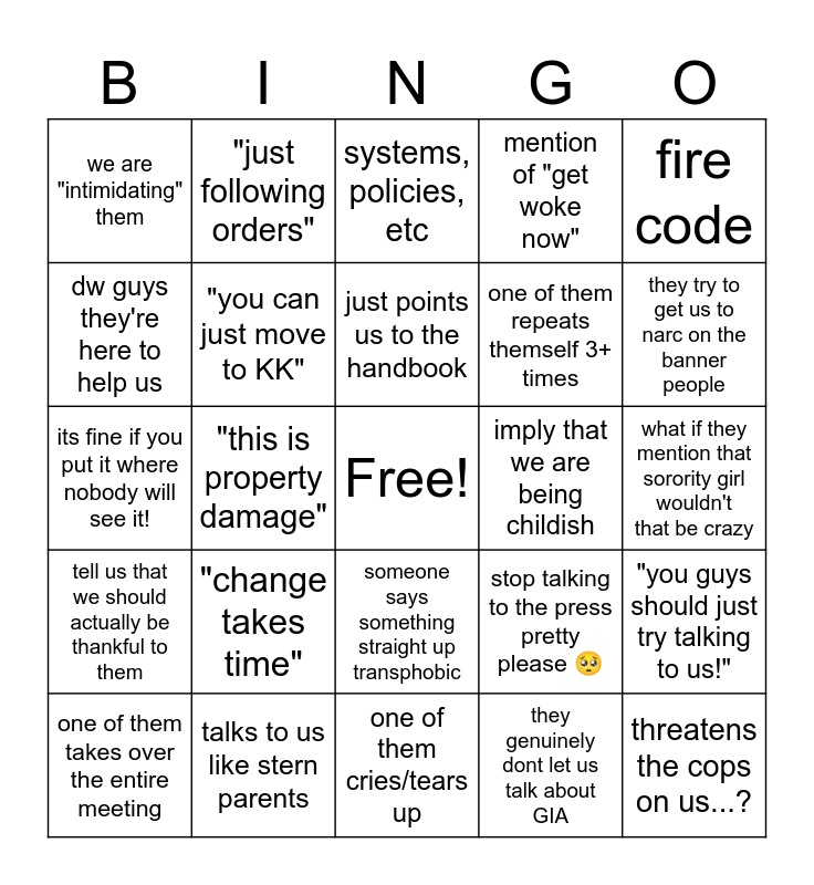 This bingo card has a free space and 24 words: "change takes time", talks to us like stern parents, just points us to the handbook, one of them takes over the entire meeting, fire code, we are "intimidating" them, dw guys they're here to help us, "just following orders", imply that we are being childish, someone says something straight up transphobic, one of them repeats themself 3+ times, its fine if you put it where nobody will see it!, stop talking to the press pretty please 🥺, "you guys should just try talking to us!", "you can just move to KK", they genuinely dont let us talk about GIA, what if they mention that sorority girl wouldn't that be crazy, systems, policies, etc, they try to get us to narc on the banner people, "this is property damage", threatens the cops on us...?, tell us that we should actually be thankful to them, mention of "get woke now" and one of them cries/tears up.