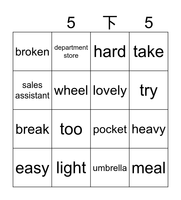 This bingo card has 16 words: light, heavy, hard, broken, break, department store, pocket, umbrella, sales assistant, wheel, easy, take, too, try, lovely and meal.
