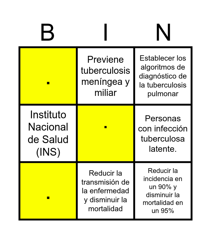 This bingo card has a free space and 8 words: Personas con infección tuberculosa latente., Establecer los algoritmos de diagnóstico de la tuberculosis pulmonar, Previene tuberculosis meníngea y miliar, ., ., Reducir la incidencia en un 90% y disminuir la mortalidad en un 95%, Instituto Nacional de Salud (INS) and Reducir la transmisión de la enfermedad y disminuir la mortalidad.