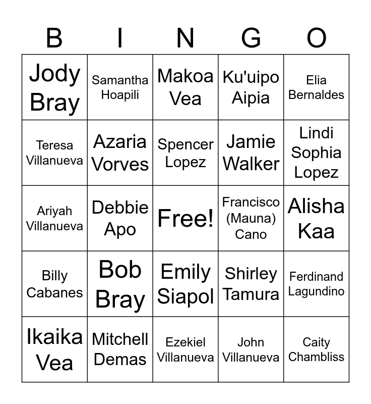 This bingo card has a free space and 116 words: Bradley Cano, Brennan Cano, Jason Wandasan, Esty Wandasan, Sam Aipia, Teresa Aipia, Ku'uipo Aipia, Tito Cabanes, Nami Cabanes, Aisha Cabanes, Akito Cabanes, Frank Bully Cano, Judy Cano, Alvin Higashi, Deborah Higashi, Ellison (Eli) Siapol, Emily Siapol, Edwina Simao, Randy Simao, Alisia Vea, Ikaika Vea, Makoa Vea, Gideon Siapol, Rosslyn Siapol, Nathaniel Simao, Billy Cabanes, Mitchell Demas, Yolanda Demas, Scott Lopez, Shayna Lopez, Lindi Sophia Lopez, Spencer Lopez, Debbie Apo, Earl Demas, Kathy Dias, Jim Jimenez, Virginia Jimenez, Lee Ann Olores, Sage Olores, Michelle Omura, Aaron Provchy, Camille Provchy, Letitia Rapozo, Tiana Sanchez, Angel Santiago, Lorita Santiago, John Villanueva, Teresa Villanueva, Michael Whitehead, Nicole Whitehead, Lance Ebert, Francisco (Mauna) Cano, Jacquelyn (Pomai) Cano, Keahi Cano, Kinohi Cano, Franchot Hawaiian Cano, Pamai Cano, Laurinda (Lei) Cano, Jade Casmass, Elly Ebert, Ferdinand Lagundino, Erdin Lagundino, Beverly Lavens, Tawnya McMurray, Austin McMurray, Napua Niau, Rose Nordmeier, Azaria Vorves, Ariyah Villanueva, Anthony Kaa, Alisha Kaa, Kuena Kaa, Michael Chambliss, Lincoln Chambliss, Logan Chambliss, Caity Chambliss, Bob Bray, Jody Bray, Savannah Cano, Leilani Duarte, Lionel Hoapili, Samantha Hoapili, Kathy Okada, Shirley Tamura, Jamie Walker, Denise Westerman, Saige Cano, Mark Kaufman, Keale Rull, Naiona Driver, Remi Driver, Kiani Driver, Isaiah Driver, Jacqueline Bernaldes, Elia Bernaldes, Danica Gonsalves, Kevin Gonsalves, Moani Keala, Abby Keala, Amber Martinez, Pearce Martinez, Kanyon Mattos, Chloe Mattos, Levi Nerpio, Nani Nerpio, Lehua Nerpio, Pohaku Nerpio, Tawai Rull, Ezekiel Villanueva, Melia Villanueva, Sofia Villanueva, Trenton Whitehead, Nainoa Leong, Tiare Leong, Taina Leong and Kawena Leong.