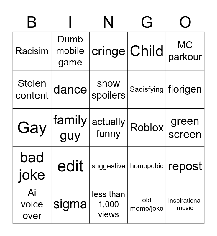 This bingo card has a free space and 24 words: edit, sigma, show spoilers, Ai voice over, MC parkour, Racisim, Stolen content, Dumb mobile game, Roblox, suggestive, Sadisfying, Gay, homopobic, repost, dance, old meme/joke, green screen, cringe, florigen, family guy, inspirational music, bad joke, Child and less than 1,000 views.