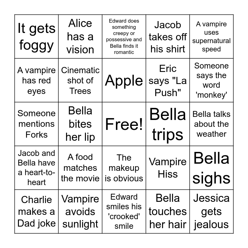 This bingo card has a free space and 31 words: Edward smiles his 'crooked' smile, Pop song plays, Bella bites her lip, Edward saves Bella, It gets foggy, Edward does something creepy or possessive and Bella finds it romantic, Cinematic shot of Trees, Vampire Hiss, Bella trips, Bella touches her hair, Bella talks about the weather, Jessica gets jealous, Vampire sparkles, Edward and Bella stare silently at each other, Someone says the word 'monkey', Bella narrates, Bella sighs, A food matches the movie, Jacob and Bella have a heart-to-heart, The makeup is obvious, A vampire uses supernatural speed, A hug, Charlie makes a Dad joke, Alice has a vision, Eric says "La Push", A vampire has red eyes, Jacob takes off his shirt, Someone mentions Forks, Vampire avoids sunlight, Apple and Someone says vegetarian.