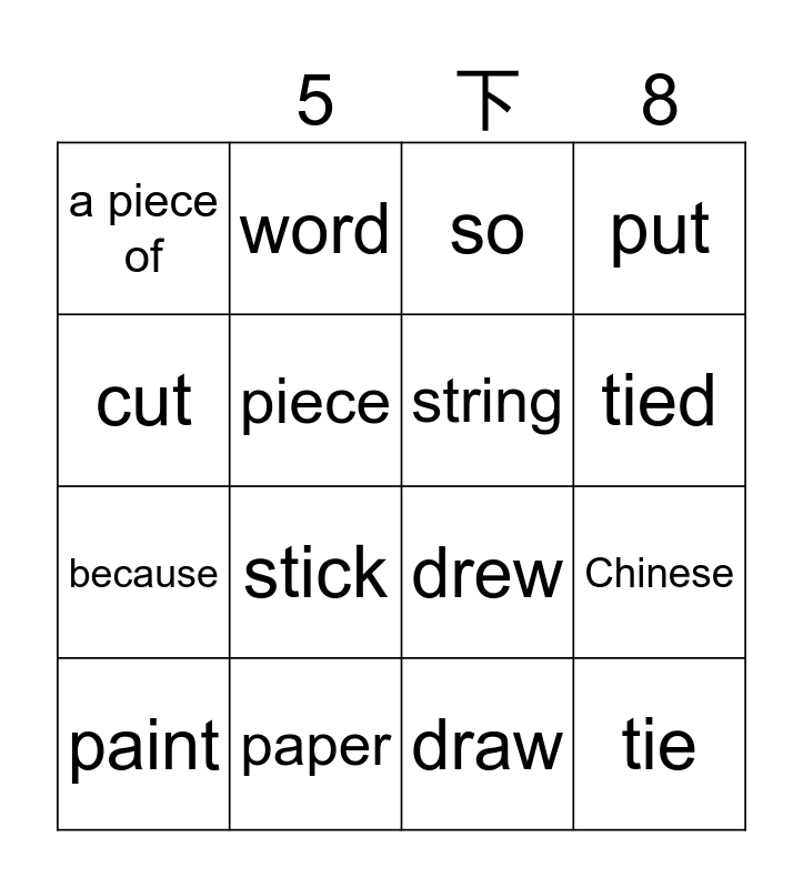This bingo card has 16 words: paper, Chinese, so, a piece of, because, word, drew, draw, cut, piece, paint, put, stick, tied, string and tie.