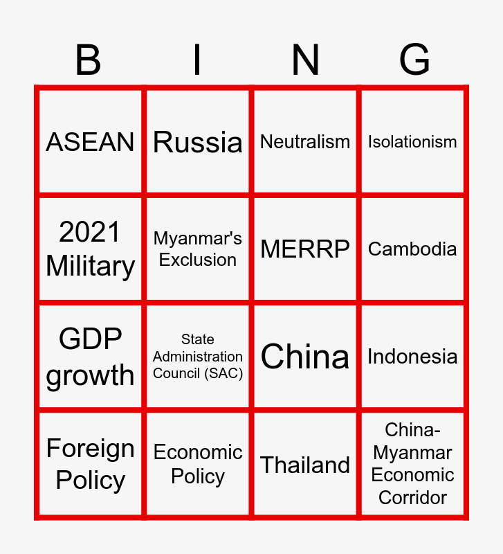 This bingo card has 16 words: Foreign Policy, Economic Policy, Neutralism, Isolationism, 2021 Military, Russia, China, Indonesia, ASEAN, Myanmar's Exclusion, Thailand, Cambodia, GDP growth, State Administration Council (SAC), MERRP and China-Myanmar Economic Corridor.