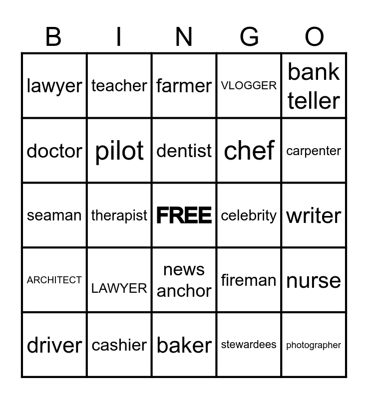 This bingo card has a free space and 24 words: LAWYER, cashier, dentist, driver, bank teller, lawyer, doctor, teacher, celebrity, news anchor, chef, seaman, fireman, nurse, pilot, stewardees, writer, farmer, carpenter, therapist, photographer, ARCHITECT, VLOGGER and baker.