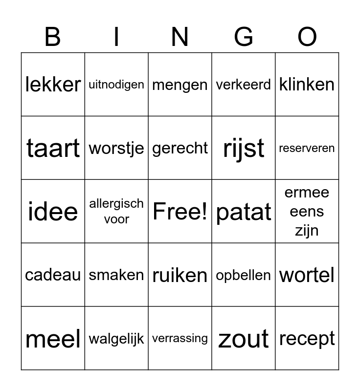 This bingo card has a free space and 45 words: zeggen, recept, boter, meel, geroosterd, zout, mengen, toevoegen, klinken, walgelijk, verkeerd, patat, ruiken, smaken, noot, verrassing, feest, idee, vrij, reserveren, uitnodigen, vriend, beter, lekker, ijs, ermee eens zijn, eruitzien, geweldig, opbellen, cadeau, vlees, wortel, paddenstoel, heerlijk, omelet, allergisch voor, lekker, bord, hoofdgerecht, gerecht, taart, rijst, gekookt, worstje and dorstig.