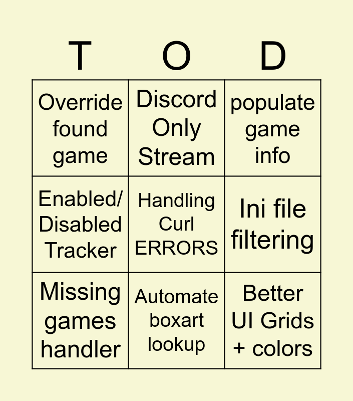 This bingo card has 9 words: Missing games handler, populate game info, Discord Only Stream, Enabled/ Disabled Tracker, Override found game, Ini file filtering, Handling Curl ERRORS, Better UI Grids + colors and Automate boxart lookup.