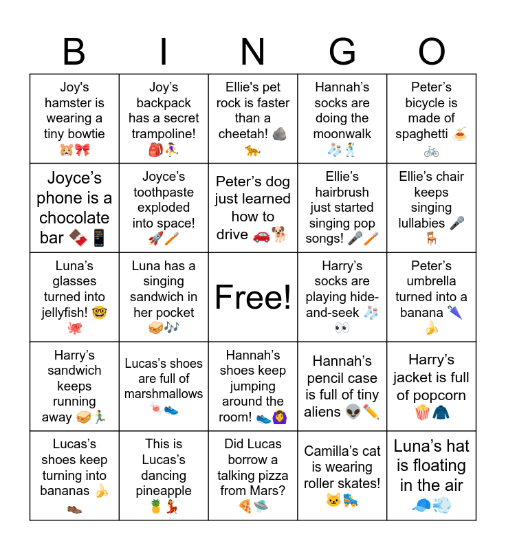 This bingo card has a free space and 30 words: This is Lucas’s dancing pineapple 🍍💃, Peter’s jellybean hat is too big! 🍬🎩, Luna has a singing sandwich in her pocket 🥪🎶, Where did Camilla’s flying donut go? 🍩✈️, Joy's hamster is wearing a tiny bowtie 🐹🎀, Ellie's pet rock is faster than a cheetah! 🪨🐆, Joyce’s toothpaste exploded into space! 🚀🪥, Hannah’s shoes keep jumping around the room! 👟🙆♀️, Harry’s socks are playing hide-and-seek 🧦👀, Did Lucas borrow a talking pizza from Mars? 🍕🛸, Peter’s umbrella turned into a banana 🌂🍌, Luna’s hat is floating in the air 🧢💨, Camilla’s cat is wearing roller skates! 🐱🛼, Joy’s spoon just started dancing 💃🥄, Ellie’s chair keeps singing lullabies 🎤🪑, Joyce’s backpack is a secret portal! 🎒🚪, Hannah’s pencil case is full of tiny aliens 👽✏️, Harry’s sandwich keeps running away 🥪🏃♂️, Lucas’s shoes are full of marshmallows 🍬👟, Peter’s bicycle is made of spaghetti 🍝🚲, Luna’s glasses turned into jellyfish! 🤓🐙, Camilla’s pencil is actually a magic wand! ✨✏️, Joy’s backpack has a secret trampoline! 🎒⛹️♀️, Ellie’s hairbrush just started singing pop songs! 🎤🪥, Joyce’s phone is a chocolate bar 🍫📱, Hannah’s socks are doing the moonwalk 🧦🕺, Harry’s jacket is full of popcorn 🍿🧥, Lucas’s shoes keep turning into bananas 🍌👞, Peter’s dog just learned how to drive 🚗🐕 and Luna’s pillow turned into a cloud ☁️🛏️.