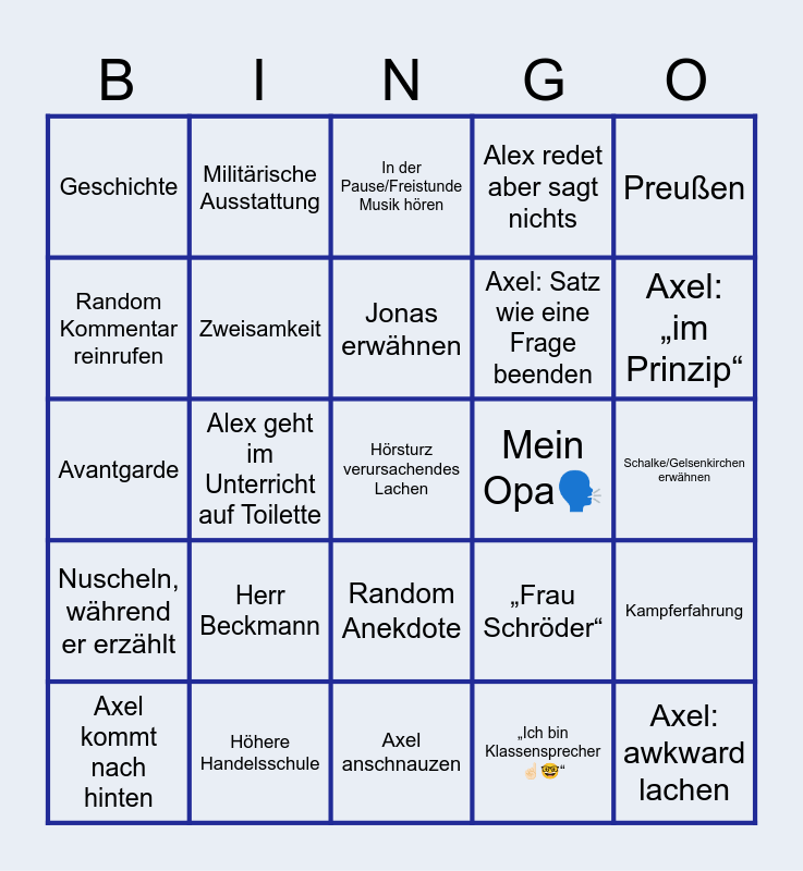 This bingo card has a free space and 24 words: Herr Beckmann, Höhere Handelsschule, Jonas erwähnen, Axel kommt nach hinten, Preußen, Geschichte, Random Kommentar reinrufen, Militärische Ausstattung, Mein Opa🗣️, Random Anekdote, Axel: Satz wie eine Frage beenden, Avantgarde, „Frau Schröder“, Kampferfahrung, Zweisamkeit, „Ich bin Klassensprecher☝🏻🤓“, Schalke/Gelsenkirchen erwähnen, In der Pause/Freistunde Musik hören, Axel: „im Prinzip“, Alex geht im Unterricht auf Toilette, Axel: awkward lachen, Nuscheln, während er erzählt, Alex redet aber sagt nichts and Axel anschnauzen.