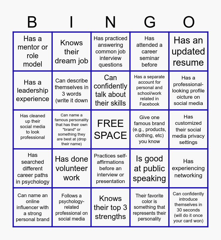 This bingo card has a free space and 48 words: Has a LinkedIn Profile, Can confidently introduce themselves in 30 seconds (will do it once your card won), Has a personal tagline/motto, Knows their top 3 strengths, Has done volunteer work, Has posted something professional online, Knows their dream job, Has a career goal set for 5 years, Has a leadership experience, Has received a recommendation from someone (e.g. work, scholarship, etc), Can describe themselves in 3 words (write it down, Has attended a career seminar before, Has experiencing networking, Is good at public speaking, Uses a professional email address (drop your email add), Has joined a school organization, Can confidently talk about their skills, Give one famous brand (e.g., products, clothing, etc) you know, Has participated in a group discussion, Has an updated resume, Can name a famous personality that has their own "brand" or something they are best at (drop their name), Their favorite color is something that represents their personality, Has a mentor or role model, Has a separate account for personal and school/work related in Facebook, Has attended a job interview before, Has a professional-looking profile oicture on social media, Can name an online influencer with a strong personal brand, Can name one psychological theory that applies to self-marketing, Practices self-affirmations before an interview or presentation, Has searched different career paths in psychology, Written a professional email, Has faced rejection and learned from it, Knows the impact of color psychology in branding, Shares specific theme of post on their social media accounts (memes, quotes, news, etc), Follows a psychology-related professional on social media, recommended a book or podcast to a friend for self-improvement, Has done mock interviews before, Has customized their social media privacy settings, Used social media to promote their skills or achievements, Can name a famous psychologist who studied personality (drop their name), Has worked on imprving their time management skills, Has created a professional email address, Has practiced answering common job interview questions, Used social media to promote their skills or achievements, Has cleaned up their social media to look professional, Has received constructive criticism and used it for growth, Has Googled their name to check what appears online and Knows how to stay motivated when faced with rejection.