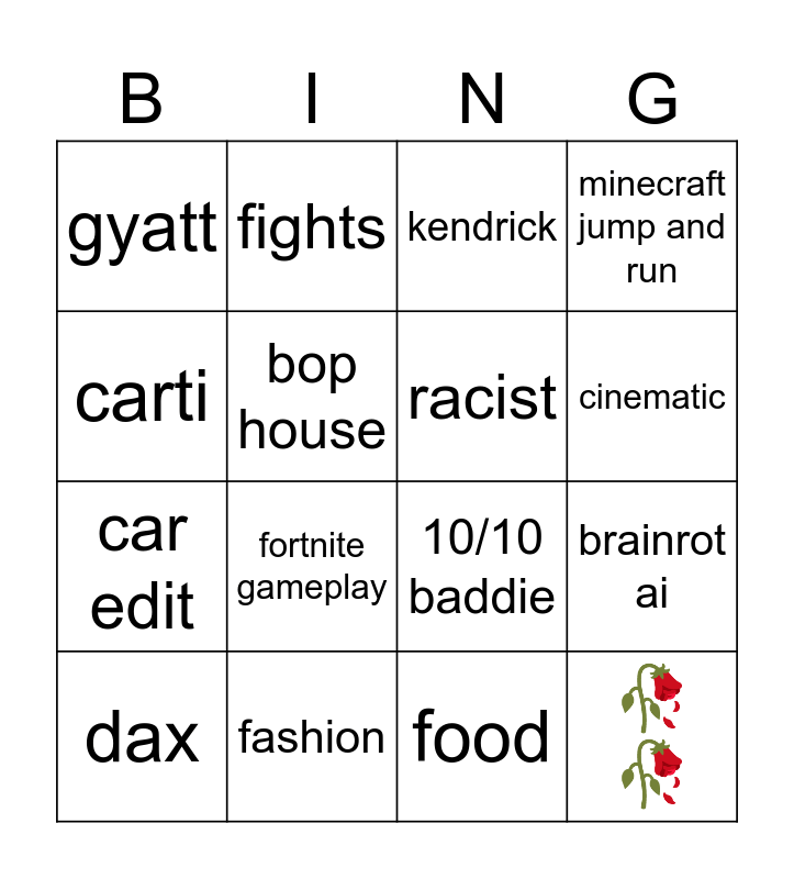 This bingo card has 16 words: fashion, brainrot ai, kendrick, gyatt, car edit, fights, 10/10 baddie, food, carti, bop house, dax, minecraft jump and run, fortnite gameplay, cinematic, racist and 🥀🥀.