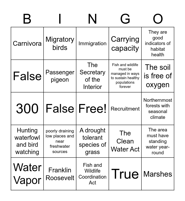 This bingo card has a free space and 29 words: Water Vapor, Trees grown in areas of agriculture to stabilize conditions of crops, False, Aldo Leopold, Carnivora, Immigration, Passenger pigeon, poorly draining low places and near freshwater sources, Recruitment, Franklin Roosevelt, Northernmost forests with seasonal climate, Marshes, Fish and Wildlife Coordination Act, True, The soil is free of oxygen, Is required in order to perform photosynthesis, A drought tolerant species of grass, Hunting waterfowl and bird watching, They are good indicators of habitat health, 300, The Clean Water Act, Run across the water to gain speed, Fish and wildlife must be managed in ways to sustain healthy populations forever, False, Carrying capacity, Migratory birds, The area must have standing water year-round, The Secretary of the Interior and Habitats utilized by migratory birds for resources along the flyway during bi-annual migration.