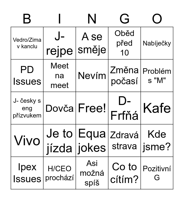 This bingo card has a free space and 24 words: Je to jízda, H/CEO prochází, Nevím, Ipex Issues, Nabíječky, Vedro/Zima v kanclu, PD Issues, J- rejpe, D- Frfňá, Equa jokes, Změna počasí, J- česky s eng přízvukem, Zdravá strava, Kde jsme?, Meet na meet, Co to cítím?, Kafe, A se směje, Problém s "M", Dovča, Pozitivní G, Vivo, Oběd před 10 and Asi možná spíš.