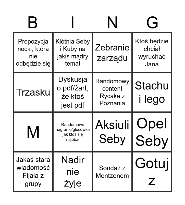 This bingo card has 16 words: Nadir nie żyje, Opel Seby, Zebranie zarządu, Propozycja nocki, która nie odbędzie się, M, Kłótnia Seby i Kuby na jakiś mądry temat, Aksiuli Seby, Sondaż z Mentzenem, Trzasku, Dyskusja o pdf/żart, że ktoś jest pdf, Jakaś stara wiadomość Fijała z grupy, Ktoś będzie chciał wyruchać Jana, Randomowe nagranie/głosówka jak ktoś się najebał, Stachu i lego, Randomowy content Rycaka z Poznania and Gotuj z.