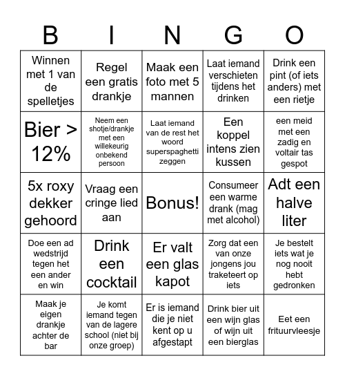 This bingo card has a free space and 24 words: Drink een cocktail, Je komt iemand tegen van de lagere school (niet bij onze groep), Laat iemand van de rest het woord superspaghetti zeggen, Maak je eigen drankje achter de bar, Drink een pint (of iets anders) met een rietje, Winnen met 1 van de spelletjes, Bier > 12%, Regel een gratis drankje, Consumeer een warme drank (mag met alcohol), Er valt een glas kapot, Een koppel intens zien kussen, 5x roxy dekker gehoord, Zorg dat een van onze jongens jou traketeert op iets, Je bestelt iets wat je nog nooit hebt gedronken, Neem een shotje/drankje met een willekeurig onbekend persoon, Drink bier uit een wijn glas of wijn uit een bierglas, Adt een halve liter, Maak een foto met 5 mannen, een meid met een zadig en voltair tas gespot, Vraag een cringe lied aan, Eet een frituurvleesje, Doe een ad wedstrijd tegen het een ander en win, Laat iemand verschieten tijdens het drinken and Er is iemand die je niet kent op u afgestapt.