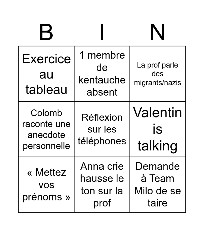 This bingo card has a free space and 8 words: Valentin is talking, La prof parle des migrants/nazis, 1 membre de kentauche absent, « Mettez vos prénoms », Exercice au tableau, Demande à Team Milo de se taire, Colomb raconte une anecdote personnelle and Anna crie hausse le ton sur la prof.