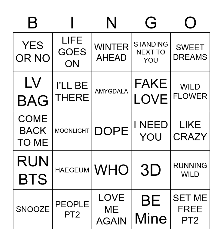 This bingo card has a free space and 24 words: HAEGEUM, PEOPLE PT2, AMYGDALA, SNOOZE, SWEET DREAMS, YES OR NO, LV BAG, LIFE GOES ON, I NEED YOU, WHO, FAKE LOVE, COME BACK TO ME, 3D, RUNNING WILD, I'LL BE THERE, BE Mine, LIKE CRAZY, WINTER AHEAD, WILD FLOWER, MOONLIGHT, SET ME FREE PT2, RUN BTS, STANDING NEXT TO YOU and LOVE ME AGAIN.