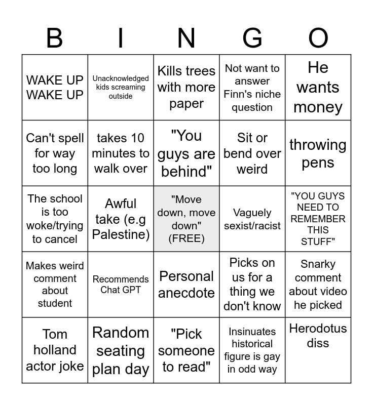 This bingo card has a free space and 24 words: Recommends Chat GPT, Random seating plan day, "You guys are behind", Tom holland actor joke, He wants money, WAKE UP WAKE UP, Can't spell for way too long, Unacknowledged kids screaming outside, Vaguely sexist/racist, Personal anecdote, Sit or bend over weird, The school is too woke/trying to cancel, Picks on us for a thing we don't know, Snarky comment about video he picked, takes 10 minutes to walk over, Insinuates historical figure is gay in odd way, "YOU GUYS NEED TO REMEMBER THIS STUFF", Kills trees with more paper, throwing pens, Awful take (e.g Palestine), Herodotus diss, Makes weird comment about student, Not want to answer Finn's niche question and "Pick someone to read".