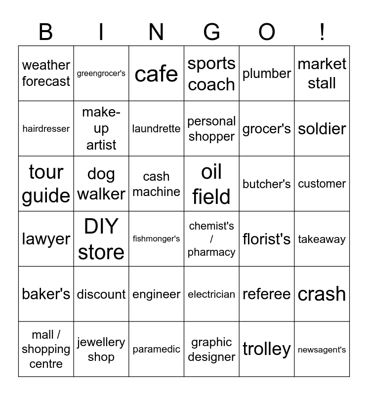 This bingo card has 36 words: electrician, engineer, graphic designer, hairdresser, lawyer, oil field, make-up artist, paramedic, plumber, referee, soldier, sports coach, crash, dog walker, personal shopper, weather forecast, baker's, butcher's, tour guide, cafe, cash machine, DIY store, chemist's / pharmacy, fishmonger's, florist's, greengrocer's, grocer's, jewellery shop, laundrette, market stall, newsagent's, mall / shopping centre, takeaway, customer, discount and trolley.