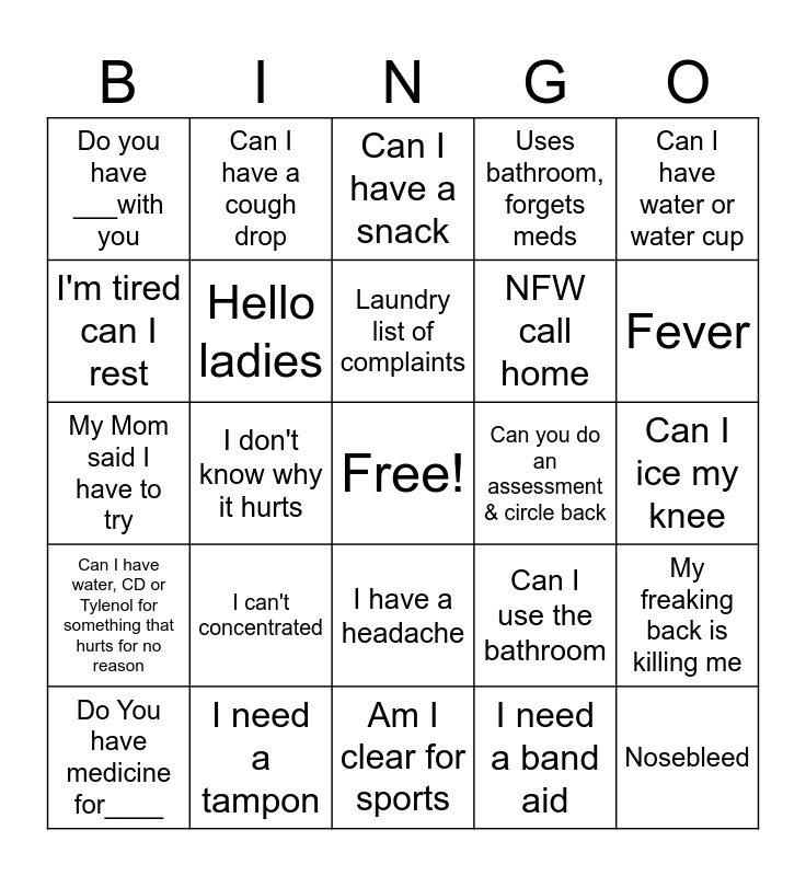 This bingo card has a free space and 24 words: I can't concentrated, I need a tampon, Laundry list of complaints, Do You have medicine for____, Can I have water or water cup, Do you have ___with you, I'm tired can I rest, Can I have a cough drop, Can you do an assessment & circle back, I have a headache, NFW call home, My Mom said I have to try, Can I use the bathroom, My freaking back is killing me, Hello ladies, I need a band aid, Can I ice my knee, Can I have a snack, Fever, I don't know why it hurts, Nosebleed, Can I have water, CD or Tylenol for something that hurts for no reason, Uses bathroom, forgets meds and Am I clear for sports.