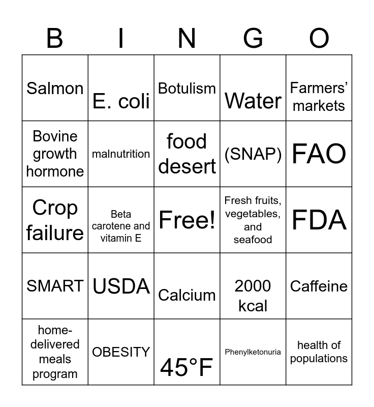 This bingo card has a free space and 24 words: USDA, OBESITY, food desert, home-delivered meals program, Farmers’ markets, Salmon, Bovine growth hormone, E. coli, Fresh fruits, vegetables, and seafood, Calcium, (SNAP), Crop failure, 2000 kcal, Caffeine, malnutrition, Phenylketonuria, FDA, Botulism, FAO, Beta carotene and vitamin E, health of populations, SMART, Water and 45°F.