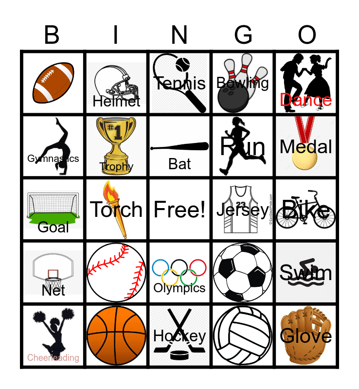 This bingo card has 24 images, a free space and 19 words: Bat, Cheerleading, Dance, Gymnastics, Helmet, Jersey, Olympics, Run, Goal, Swim, Trophy, Bike, Tennis, Medal, Torch, Glove, Net, Bowling and Hockey.