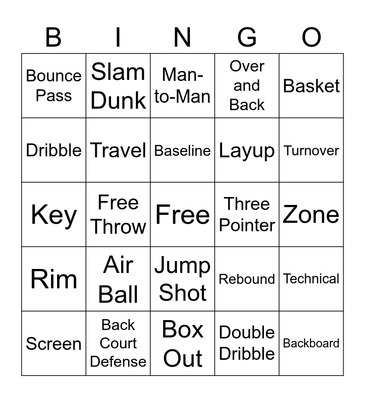 This bingo card has a free space and 24 words: Air Ball, Back Court Defense, Baseline, Screen, Basket, Bounce Pass, Dribble, Slam Dunk, Three Pointer, Jump Shot, Layup, Key, Rebound, Technical, Travel, Double Dribble, Zone, Man-to-Man, Turnover, Free Throw, Backboard, Rim, Over and Back and Box Out.