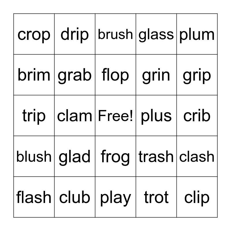 This bingo card has a free space and 24 words: glad, club, flop, flash, plum, crop, brim, drip, plus, frog, grin, trip, trash, clash, grab, trot, crib, brush, grip, clam, clip, blush, glass and play.