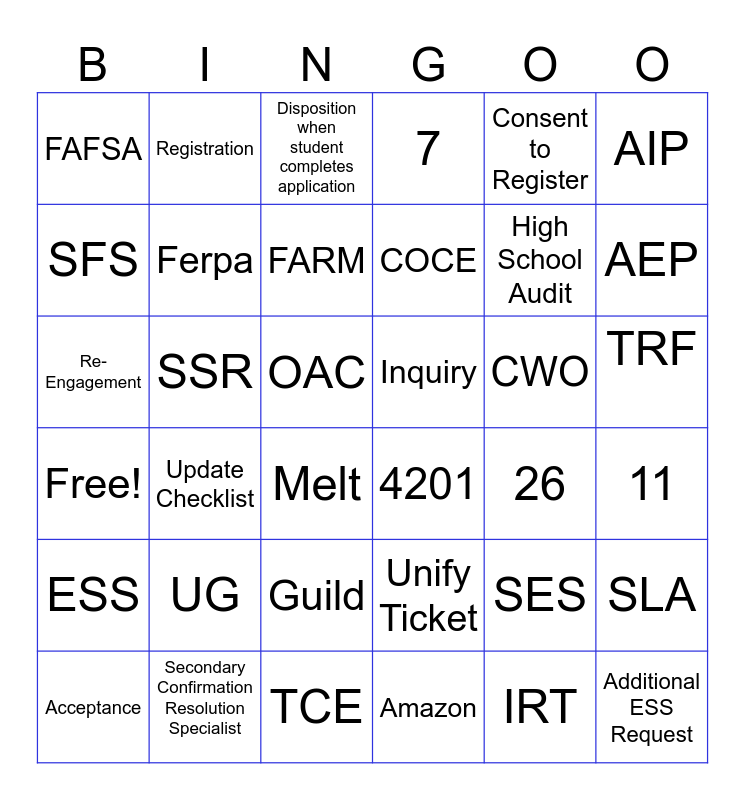 This bingo card has 40 words: Free!, Ferpa, B2B, 7, 26, 11, FAFSA, RAT, FARM, COCE, CWO, AEP, SFS, SSR, OAC, Inquiry, IRT, AIP, ESS, Registration, Melt, Unify Ticket, Consent to Register, TRF, Acceptance, UG, Guild, Amazon, SES, Additional ESS Request, Attestation, Update Checklist, TCE, 4201, High School Audit, SLA, Re-Engagement, Secondary Confirmation Resolution Specialist, Disposition when student completes application and Secondary Confirmation.