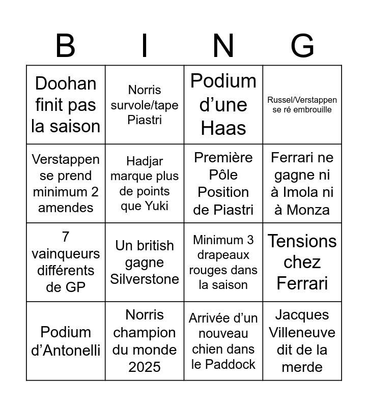 This bingo card has 16 words: Norris champion du monde 2025, Tensions chez Ferrari, Podium d’une Haas, Doohan finit pas la saison, 7 vainqueurs différents de GP, Norris survole/tape Piastri, Minimum 3 drapeaux rouges dans la saison, Arrivée d’un nouveau chien dans le Paddock, Verstappen se prend minimum 2 amendes, Hadjar marque plus de points que Yuki, Podium d’Antonelli, Russel/Verstappen se ré embrouille, Un british gagne Silverstone, Ferrari ne gagne ni à Imola ni à Monza, Première Pôle Position de Piastri and Jacques Villeneuve dit de la merde.