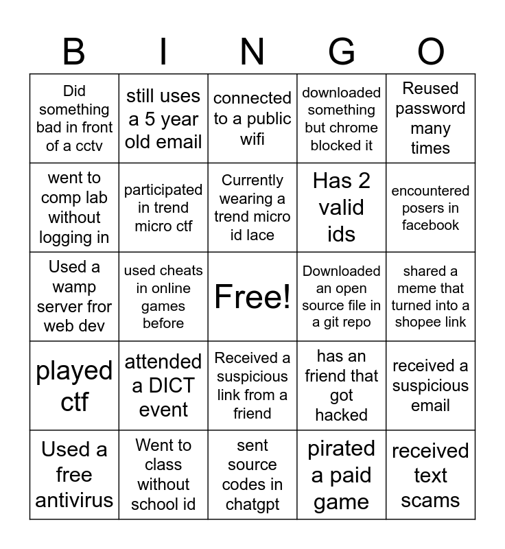 This bingo card has a free space and 24 words: attended a DICT event, Went to class without school id, Currently wearing a trend micro id lace, Used a free antivirus, Reused password many times, Did something bad in front of a cctv, went to comp lab without logging in, still uses a 5 year old email, Downloaded an open source file in a git repo, Received a suspicious link from a friend, Has 2 valid ids, Used a wamp server fror web dev, has an friend that got hacked, received a suspicious email, participated in trend micro ctf, pirated a paid game, shared a meme that turned into a shopee link, connected to a public wifi, encountered posers in facebook, used cheats in online games before, received text scams, played ctf, downloaded something but chrome blocked it and sent source codes in chatgpt.