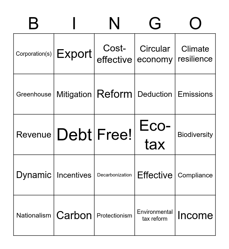 This bingo card has a free space and 70 words: Adjustment, Biodiversity, Businesses, Cap-and-trade, Carbon, Carbon offset, Circular economy, Climate Club, Climate resilience, CO₂ (said out loud as “Cee Oh Two”), Compliance, Compliance costs, Corporation(s), Cost-effective, Credit, Debt, Decarbonization, Deduction, Double dividend, Dynamic, Eco-tax, Effective, Emissions, Emissions Trading, Enforcement, Environmental externalities, Environmental impact assessment, Environmental levy, Environmental tax reform, Equity, Export, Fair, Fiscal Year, Fossil fuel subsidies, Fuel (without the word “fossil”), Geoengineering, Global Commons, Green bonds, Green investment, Greenhouse, Households, Incentives, Income, Intergenerational, Market-based instruments, Mitigation, Nationalism, Natural capital, Paris Agreement, Pigouvian tax, Policy, Political Economy, Polluter-pays principle, Pollution, Protectionism, Redistribution, Reform, Regulation, Regulations, Resource depletion, Revenue, Stock, Subsidies, Sustainable, Tariffs, Tax, Tax neutrality, Trade, Treasury and WTO or World Trade Organization.