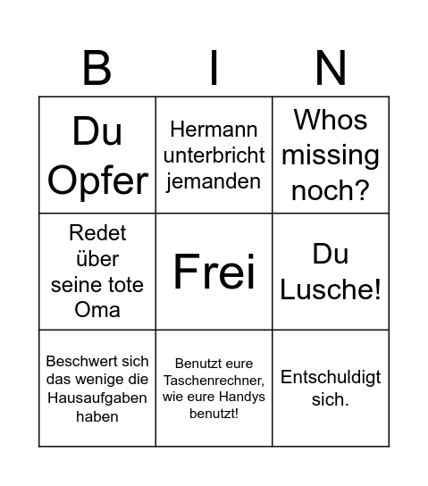 This bingo card has a free space and 8 words: Du Lusche!, Whos missing noch?, Hermann unterbricht jemanden, Beschwert sich das wenige die Hausaufgaben haben, Du Opfer, Entschuldigt sich., Redet über seine tote Oma and Benutzt eure Taschenrechner, wie eure Handys benutzt!.
