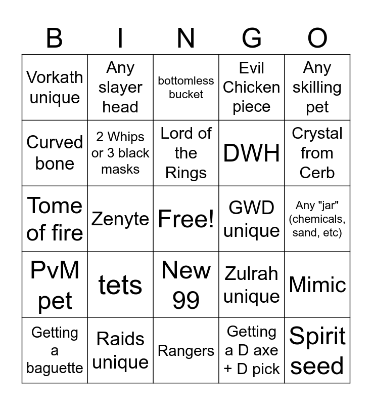 This bingo card has a free space and 24 words: tets, Raids unique, Lord of the Rings, Getting a baguette, Any skilling pet, Vorkath unique, Curved bone, Any slayer head, GWD unique, New 99, DWH, Tome of fire, Zulrah unique, Mimic, 2 Whips or 3 black masks, Getting a D axe + D pick, Any "jar" (chemicals, sand, etc), bottomless bucket, Crystal from Cerb, Zenyte, Spirit seed, PvM pet, Evil Chicken piece and Rangers.