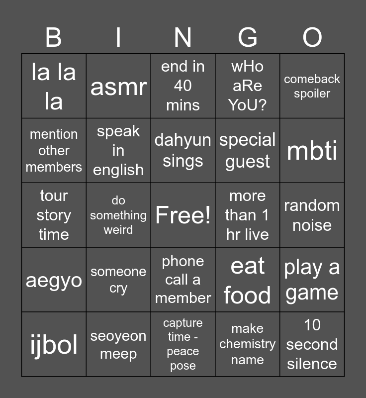 This bingo card has a free space and 24 words: someone cry, seoyeon meep, dahyun sings, ijbol, comeback spoiler, la la la, mention other members, asmr, more than 1 hr live, phone call a member, special guest, tour story time, eat food, play a game, speak in english, make chemistry name, random noise, end in 40 mins, mbti, do something weird, 10 second silence, aegyo, wHo aRe YoU? and capture time - peace pose.