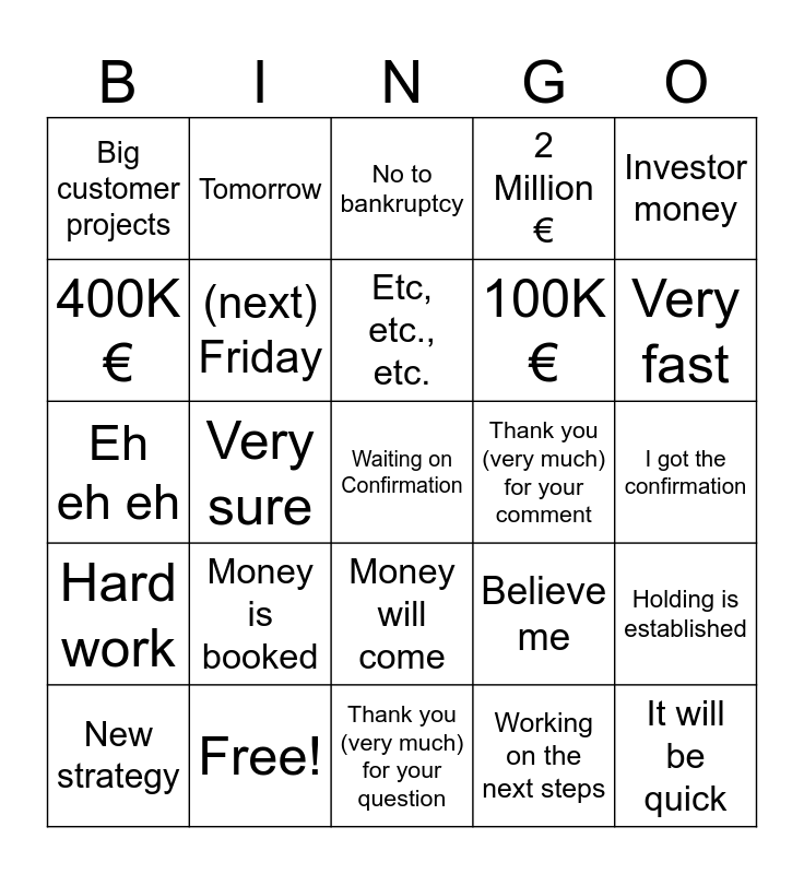 This bingo card has 30 words: Free!, 100%, Very sure, Pretty sure, Big customer projects, No to bankruptcy, (next) Friday, Money will come, Thank you (very much) for your comment, Thank you (very much) for your question, I got the confirmation, Waiting on Confirmation, Working on the next steps, It will be quick, Very fast, Technical difficulties, Believe me, Hard work, Money is booked, Investor money, Eh eh eh, Good news, Tomorrow, 100K €, 400K €, 2 Million €, Holding is established, New strategy, Etc, etc., etc. and I had a lot of calls.