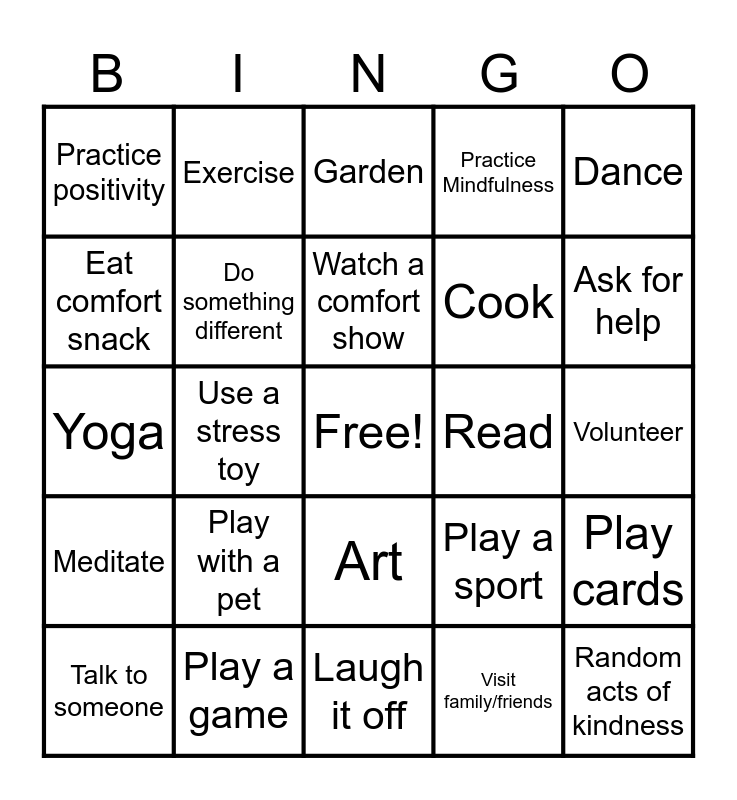 This bingo card has a free space and 29 words: Talk to someone, Pop Bubble-Wrap, Use a stress toy, Play with a fidget toy, Practice positivity, Garden, Do something different, Play with a pet, Read, Play a game, Volunteer, Random acts of kindness, Laugh it off, Visit family/friends, Ask for help, Take a bath/shower, Art, Meditate, Dance, Yoga, Play a sport, Biking/hiking, Cook, Eat comfort snack, Practice Mindfulness, Exercise, Play cards, Watch a comfort show and Sing/listen to music.