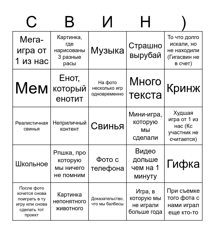 This bingo card has a free space and 24 words: Рпшка, про которую мы ничего не помним, Картинка непонятного животного, На фото несколько игр одновременно, После фото хочется снова поиграть в ту игру или снова сделать тот проект, То что долго искали, но не находили (Гигасвин не в счет), Мега-игра от 1 из нас, Мем, Картинка, где нарисованы 3 разные расы, Мини-игра, которую мы сделали, Фото с телефона, Много текста, Реалистичная свинья, Видео дольше чем на 1 минуту, Гифка, Енот, который енотит, Игра, в которую мы не играли больше года, Худшая игра от 1 из нас (Кс участник не считается), Музыка, Кринж, Неприличный контент, При съемке того фота с нами играл еще кто-то, Школьное, Страшно вырубай and Доказательство, что мы балбесы.