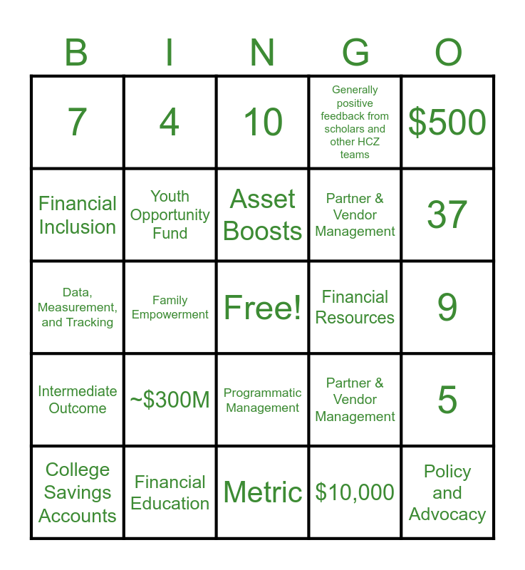 This bingo card has a free space and 24 words: ~$300M, Financial Education, Asset Boosts, College Savings Accounts, $500, 7, Financial Inclusion, 4, Financial Resources, Programmatic Management, Partner & Vendor Management, Data, Measurement, and Tracking, Partner & Vendor Management, 5, Youth Opportunity Fund, $10,000, 9, 10, 37, Family Empowerment, Policy and Advocacy, Intermediate Outcome, Generally positive feedback from scholars and other HCZ teams and Metric.