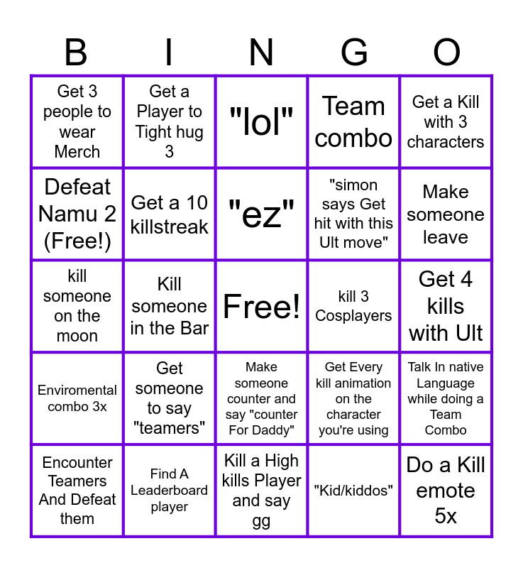 This bingo card has a free space and 24 words: Encounter Teamers And Defeat them, Get someone to say "teamers", "ez", "Kid/kiddos", Get a Kill with 3 characters, Get 3 people to wear Merch, Get a Player to Tight hug 3, "lol", kill 3 Cosplayers, Get 4 kills with Ult, kill someone on the moon, Get a 10 killstreak, Get Every kill animation on the character you're using, Talk In native Language while doing a Team Combo, Defeat Namu 2 (Free!), Find A Leaderboard player, Kill a High kills Player and say gg, Team combo, Make someone leave, Enviromental combo 3x, Kill someone in the Bar, Make someone counter and say "counter For Daddy", "simon says Get hit with this Ult move" and Do a Kill emote 5x.